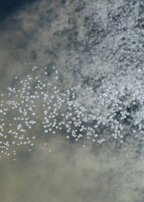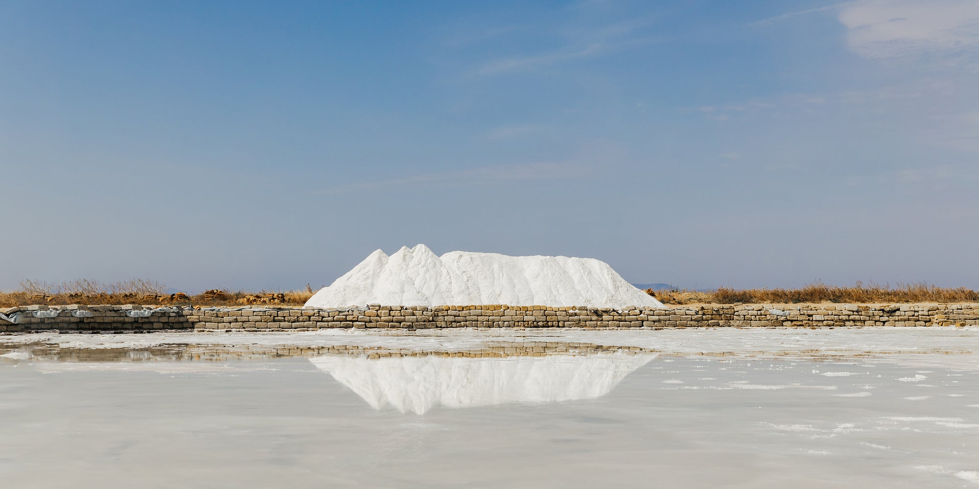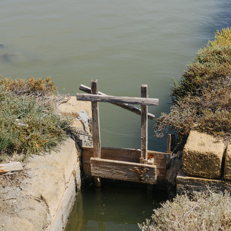 In the spring, sea water is allowed to travel naturally via a canal to the main salt pans, where it rests until it reaches the desired salinity point. From there, this briny water is slowly fed into adjoining, shallower salt pans where the salt crystallization can begin.